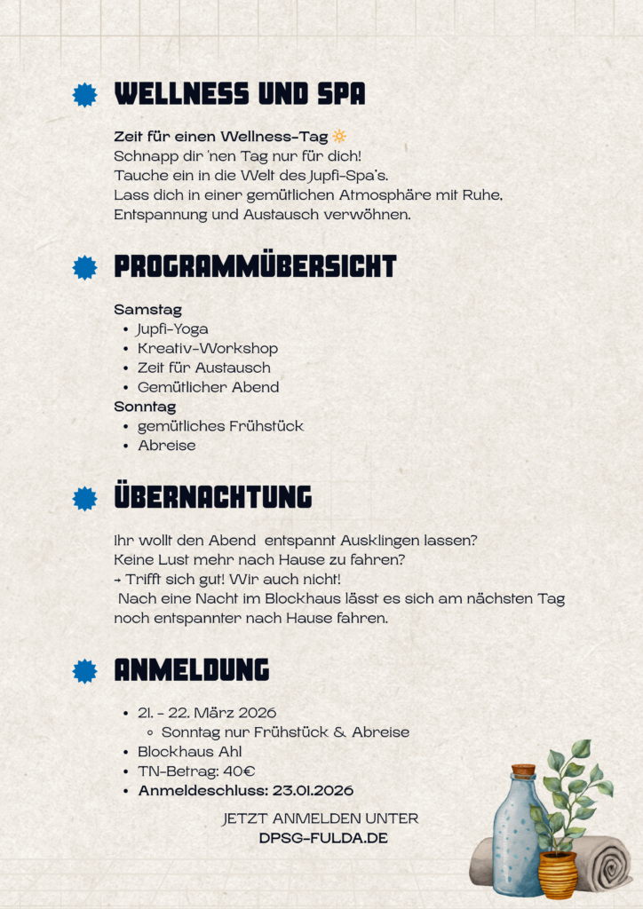 Die letzten Monate mit Deinen Jupfis haben Dich urlaubsreif gemacht? Das trifft sich gut, denn am 21. und 22. März hat dein Jupfi-AK die Blockhütte Ahl gemietet und ein kleines Wellnessprogramm auf die Beine gestellt.