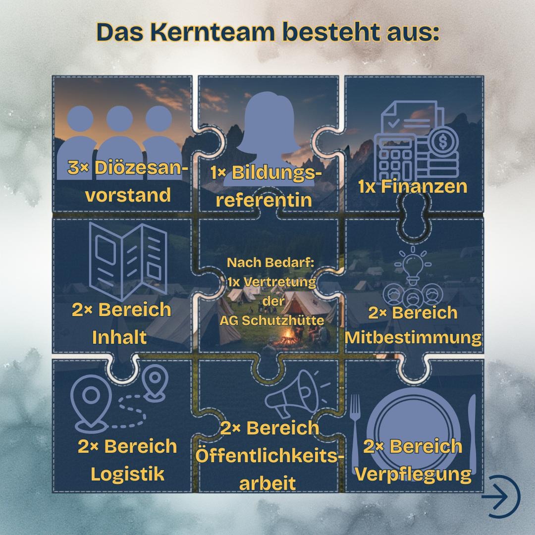 Das Kernteam arbeitet eng mit dem Diözesanvorstand, der Bildungsreferent*in und den zuständigen Arbeitskreisen zusammen. Gemeinsam entwickeln wir Schritt für Schritt ein Diözesanlager, das unser pfadfinderisches Miteinander stärkt und den DV Fulda verbindet.